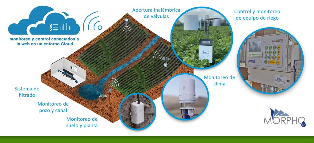 Es una solución de monitoreo y control para el riego en sistemas Agrícolas, la componen elementos sensores y nodos de monitoreo y control conectados a la web en un entorno Cloud y gestionados con nuestra poderosa plataforma @agviewer y una App Móvil. Son los encargados de controlar y monitorear las diferentes elementos que son parte de solución global en relación a la gestión del agua.